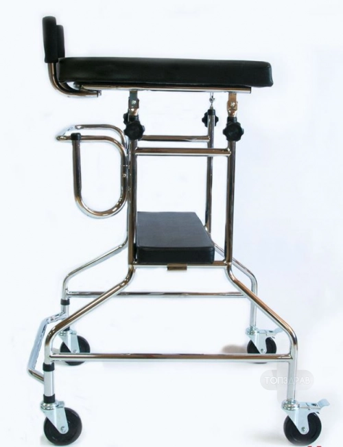 Конструкция ходунков выполнена из хромированной стали, сиденье и подлокотная опора – из искусственной кожи. Четыре колеса конструкции обеспечивают легкость передвижения без лишних усилий. Задние колеса оснащены стояночными тормозами.